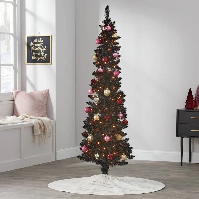 Light up your decor during the holidays with this Pre-lit Shiny Black Alberta Spruce Artificial Christmas Tree from Wondershopâ„¢. This six-foot-tall faux Alberta spruce Christmas tree is densely covered with shiny black pull-down branches for easy storage and display, and it comes pre-lit with 150 clear light bulbs with a constant effect. The artificial decorative tree is completely maintenance-free, and it includes a plastic base for easy and stable placement on the ground. Simply add ornaments, garlands, ribbons and a tree skirt to create a classic Christmas look you’ll enjoy year after year.