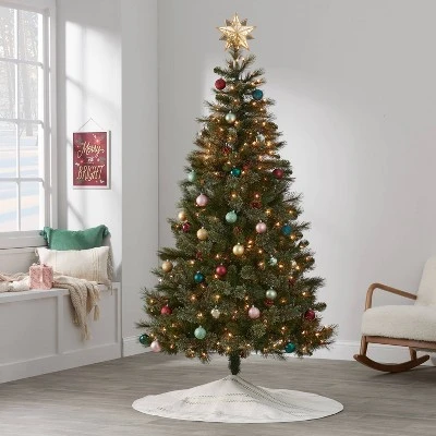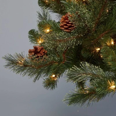 Transform your home into a fairytale setting throughout the festive season with this Pre-lit Artificial Virginia Pine Christmas Tree with Pinecones from Wondershopâ„¢. This pre-lit artificial Virginia pine tree features lush green hinged branches accented throughout with faux pinecones to add cheer and fuss-free upkeep to your home, and it includes a metal stand for stable floor display. Plus, it arrives pre-strung with 300 clear constant bulbs that bring bright ambiance to your living space. Just plug in and enjoy the spirit of the season.