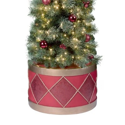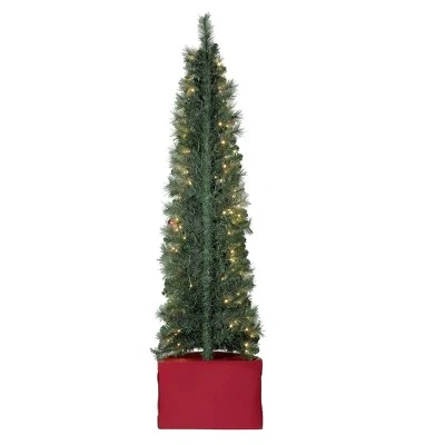 Wonderfully Festive Christmas tree is perfect for small space decorating because of its flat back. This feature allows you to tuck it just about anywhere. The resin base is shaped like a drum which adds a merry touch to its holiday charm. Pre-decorated with a blend of shiny and glitter red shatterproof plastic ornaments and 300 warm white lights along with its mixed PVC greenery branches creates a nice full look to the tree. The cord is UL listed for indoor use. Measures 20-inch Diameter x 80 inches High. Weighs 30.7 pounds.