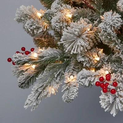 Fill your home with festive cheer this holiday season with this Pre-lit Slim Flocked Virginia Pine Artificial Christmas Tree with Red Berries from Wondershopâ„¢. This seven-foot-tall faux Virginia pine Christmas tree is densely covered with flocked branches and bright red berries to brings a wintry feel to your home, and it comes pre-lit with 300 clear light bulbs with a constant effect. The artificial construction makes it completely maintenance-free, and it includes a metal base for easy and stable placement on the ground. Simply add ornaments, garlands, ribbons and a tree skirt to create a classic Christmas look you’ll enjoy year after year.