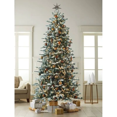 Make your home feel like a fresh snow fall with this beautifully flocked 9′ Pre-Lit Christmas Balsam Fir Christmas Tree from Wondershop. This tree is Pre-Lit with 700 Clear lights and features the AutoConnect Pole that makes for easy assembly. The AutoConnect technology enables each of the tree’s sections to light up automatically,without any hassle of searching for plugs or connecting light strings. For your decorating needs it also has a stackable plug in the tree top section for connecting a pre-lit tree topper. The branches feature 3,045 natural looking molded, lightly flocked PE and PVC tips that are pre-attached for easy to setup. This Tree Works with Rotating Tree Stand-Sold Separately.
