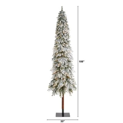 Set up a winter-inspired Christmas scene even in a limited space environment with the help of this 9ft. Flocked Grand Alpine Artificial Christmas Tree with 600 Clear Lights and 1183 Bendable Branches on Natural Trunk by Nearly Natural. Easy and effortless, this winter-inspired artificial Christmas tree boasts a slim and slender silhouette made up of 1183 easy-to-bend branches to showcase all your favorite holiday ornaments and beautifully flocked in a winter coating of faux snow to evoke the impression of freshly fallen snow. Arriving pre-strung with 600 clear LED lights to eliminate unsightly tangles and carefully stabilized on an extended faux wooden pole and metal stand, this snowy 9ft. artificial Christmas tree will undoubtedly transform your holiday decor, year after year. Artificial Christmas Trees are manufactured using synthetic materials, such as polyester material or plastic, and are well designed and constructed to be life-like in appearance. This item will need to be re-shaped when removed from the secure box to allow it to reach its fullest size.