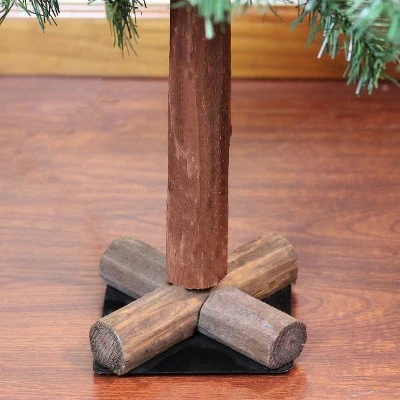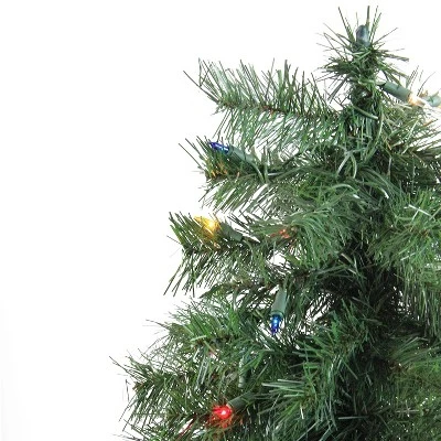 This Alpine tree is full of woodland charm and features dark green 2 inch wide tips that sit on a realistic wood trunk Product Features: 250 branch tips Pre-lit with 100 multi-color mini lights If one bulb burns out, the rest will stay lit 3-piece easy assembly (including base) Light sets on tree are UL listed for indoor or outdoor use, however the tree itself is recommended for indoor use 24 inch green lead cord Comes with spare replacement bulbs and fuses 120 volt, 60 hertz, .17 amps, 20.4 watts Dimensions: 4′ high (from the base of stand to the top of the tree) 24″ base diameter (widest point) Material(s): PVC/metal/glass bulbs/wire/woodNote: Branches are compressed for shipment, and need to be fluffed out upon arrival to look like the photo.