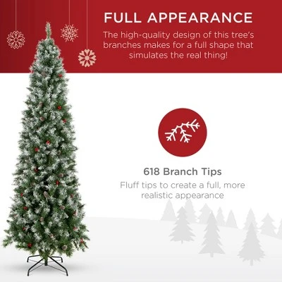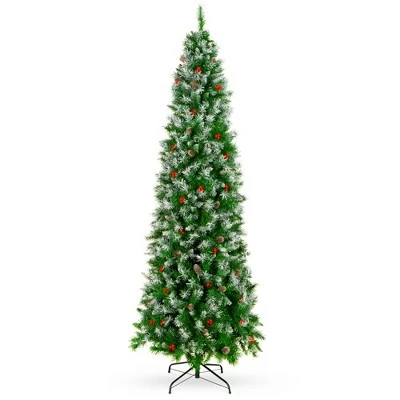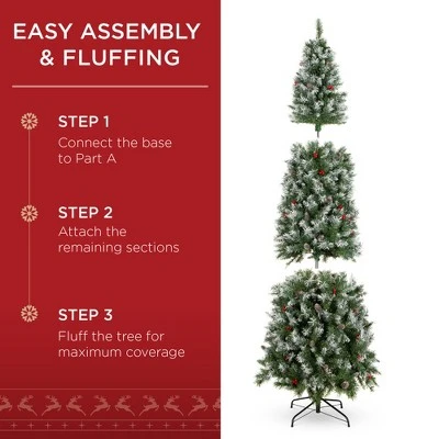 Celebrate the holidays with this elegantly modern Christmas pencil tree! This tree comes pre-decorated with berries and pinecones dispersed within flocked branches and crafted with durable metal hinges. Flame-resistant PVC branches also guarantee a safe and festive holiday. This tree features a simple 3 step assembly: step 1 connect the base to part A, step 2 attach the remaining sections, step 3 fluff the tree for maximum coverage! However you decide to use this tree, it’s quality and style promise years of enjoyment!