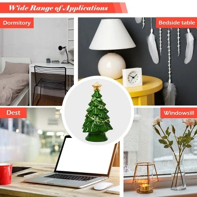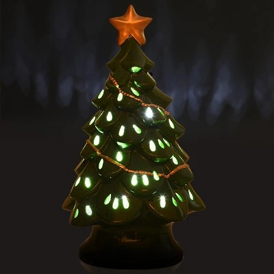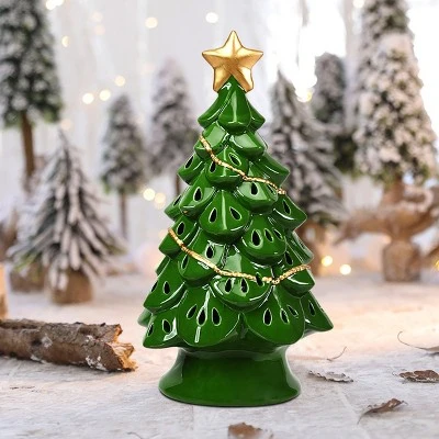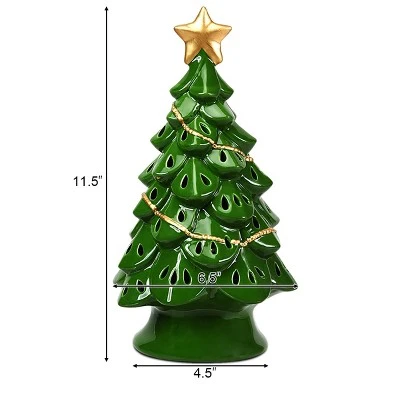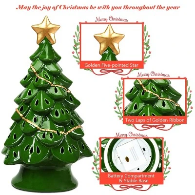 - Ceramic Tree with Gold Ribbons and Top Star: This mini Ceramic Christmas tree comes with decorative gold ribbons and top star which makes it beautiful and special. The inside LED lights and top star will brighten your home.