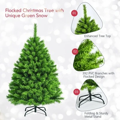 Do you need a realistic Christmas tree to bring home vividness? Fortunately, this flocked artificial Christmas tree as charming as the real tree. Verdant leaves with flocked design make tree flourishing in appearance. And thick leaves allow you to add extra ornaments for wonderful festival effect. 3 Hinged sections make it easier building up this tree in short time. Fluff the tree to create a denser look. Made of premium PVC, the tree needs no maintenance yet keeps brand new for next year reuse. And supported by metal stand, this upright full-bodied tree can keep stable all season long. All in all, this ideal Christmas tree spread strong festival vibe to different occasions, letting you have happy holiday time.