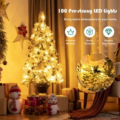 If you want decorate your entrance to welcome your family and friends in the Christmas, you can look at our 4ft snow flocked Christmas tree. This potted Xmas tree is covered by thick snow powder to create a wintry atmosphere. Its full-bodied appearance is formed by 223 branch tips that include 3 different types. Such lifelike and vivid branch tips are made of 100% new PVC and PE materials to ensure its performance. These smell-free and non-toxic tips are uneasy to fade or fall off in daily use. Equipped with 100 bright LED lights, the tree will glitter attractive warm white lights in the darkness. It will be a good guidepost for your family and friends when the night falls. The stable and elegant urn base allows you to place it anywhere you like.