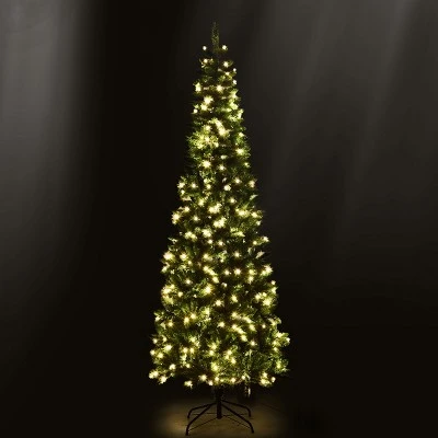 This is our 7.5 ft pre-lit pencil Christmas tree which is designed with 1085 branch tips to offer a realistic and lush appearance. Pre-installed with 350 warm white LED lights, the slim tree saves you the hassle of hanging up the lights and help light up your room. It is effortless to make the tree fluff due to its hinged construction, while also facilitating its assemble and storage. Foldable X-shaped iron stand with foot pads prevents breakage and enhances the balance of the tree, offering stability to keep the wondrous tree standing all year around. Whether for your home, courtyard, or for commercial places like shops, hotels, the slim Christmas pencil tree is the perfect eye-catching decoration to add multiple fun and festive holiday fullness!
