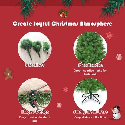 Enjoy a Christmas season full of happiness with the luxurious 6 ft Christmas tree. It consists of 3 hinged sections, which features super easy assembly, disassembly and storage. So that you can build it by yourself with less effort, store it in the end of festive, and reuse it in the next Christmas. Its flourishing pine needles will never let you down, which delivers an eye-catching lush appearance. Bright green color makes the tree full of energetic feeling to light up your home. Feel confident to place it in your house, since it is delicately crafted with 100% new high quality PVC material, no odor, non flammable, non allergic. Needless to say, its sturdy iron stand will keep the tree stand straightly all season long. Bring the pine artificial Christmas tree home, get into the Christmas atmosphere and share rejoicing with beloved family.