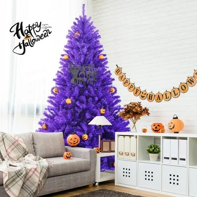 A full-bodied 7ft Halloween tree in purple brings mysterious atmosphere to your room