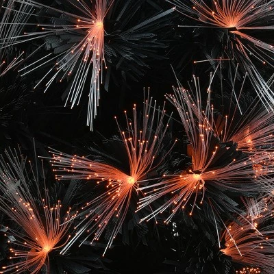 This Halloween tree features black branches that are mixed with fiber optic light tips that glow in the traditional colors of a candy corn, white, orange and yellow. Located at the base of the tree is a control box where a button can be pushed to cycle through eight different light functions including steady on, flashing and fading variations. A remote control is also included to operate light functions. This tree will add a dazzling light show to your Halloween decorating scheme.