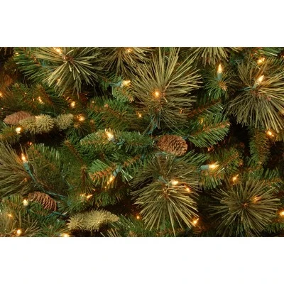 This Carolina Pine tree features mixed bristle and cashmere branch tips and is trimmed with flocked pine cones. It is pre-strung with 900 clear lights that remain lit even if a bulb burns out. This four section tree features hinged branches for ease of assembly. Sturdy folding metal tree stand is included.