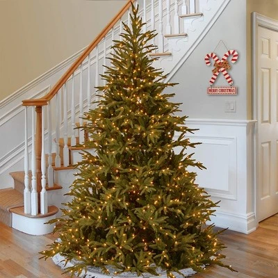 No sap. No needles piling up on the floor. No random wildlife waiting to pounce from your tree this year with National Tree Company’s Feel Real Frasier Grande 9-Foot Prelit Christmas Tree. Skip the messy setup and watering schedule with this artificial tree’s convenient hinged branches, pre-strung lights, and built-in base. Featuring a PowerConnect system and 900 Dual Color LED bulbs, you can switch between white and multicolor lights. This feature includes a switch to control 10 different light functions, allowing the bulbs to twinkle, flash or fade on either color setting. The sturdy metal base will keep the tree from tipping over from unexpected bumps, likely to happen if kids and pets are around. This lighted tree is just what you need to add that special touch to your home for the holidays. This tree measures 77 inches long, 77 inches wide, and 108 inches tall.Don’t risk frostbite this year going out into the wilderness to find the perfect tree when National Tree Company’s 9-Foot Feel Real Frasier Grande Artificial Christmas Tree has got you covered.
