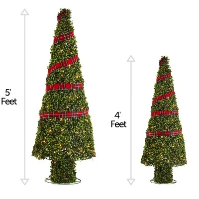 - Set of 2 cone Christmas trees decorated with 150 pre-lit bulbs for a warm, inviting glow day or night