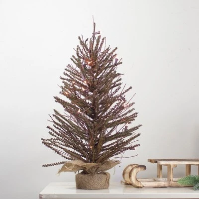 The warsaw twig tree has a realistic, primitive look, so natural, and even mother nature would be amazed. It displays two-tone, neutral tips with exposed bendable twigs. This rustic burlap base lends a country feel.Product Features:Pre-lit with 20 clear lights Bulb size: mini320 branch tips30″ brown lead cordAdditional Product Features:Medium profile treeNo assembly required – tree comes in 1 pieceLights are equipped with lamp lock feature Contains 1 plug with end connector Connector allows to stack multiple lighted items together (not to exceed 210 watts) Comes with replacement bulbs and spare fusesRecommended for indoor use onlyDimensions: 2′ high (from the base of pot to the top of the tree)14″ base diameter (at the widest point) Material(s): PVC/wire/metal/plastic