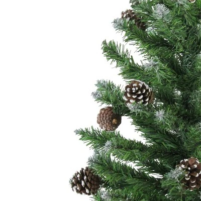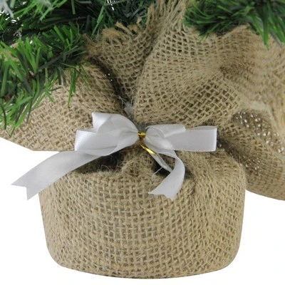 Set a festive tone in your home, office or dorm room with this frosted Norway holiday tree. Showcasing white-tipped pine cone accents, the tree will infuse a forest feel into your holiday decor. The two-tone green needles offer a realistic appeal. It will make an enchanting addition anywhere it is placed.Product Features:Unlit72 tips1.5″ wide tapered tipsMedium profile treeRecommended for indoor use onlyCountry rustic burlap base tied with jute ropeBendable wire branches for easy positioningDimensions: 24″ high (including the base)Distance from floor to the first row of branches: 4″16″ base diameter (at the widest point)Round base: 3.5″ diameterMaterial(s): PVC/metal/burlap/woodNote: Branches are compressed for shipment, and need to be fluffed out upon arrival to look like the photo