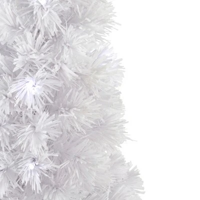 Look at this beautiful fiber-optic white holiday tree, perfect for any holiday decor! The tree features multi-colored lights, a lighted star on top with a silver bottom base that reads “Merry holiday”, the base plugs into the wall to make your holiday tree come alive! You can place this piece on your end table, mantel, or even make this tree your child’s own first holiday tree.Product features: Pre-lit fiber optic tree has a multi-color wheel at baseFiber optic colors include: red, green, amber, pink and clearTree also comes with cool white LED lightsBulb size: concave wide angle2.5″ wide branch tipsIncludes an attached silver tree stand with an on/off switchThe tree stand plugs into the tree, lighting the topper and LED lightsThis stand reads Merry holiday with jingle bells, ribbon, angel, candy cane, stars, and a moonCan be used as a tabletop decorationBranches are bendable to help accommodate your decorating needsAdditional product features:2-piece easy assembly (including stand) UL listed for indoor use only Black adapter included lights up the entire treeAdapter input: 120 volts, 60 hertzAdapter output: 12 volts, 0.12 ampsBlack lead cord is approximately 10′ long Cannot be connected to other lighted itemsDimensions: 3′ high (from the base of the pot to the top of the tree)19″ base diameter (at the widest point)Pot dimensions: 5″ high x 5.5″ wideMaterial(s): PVC/plastic/wire