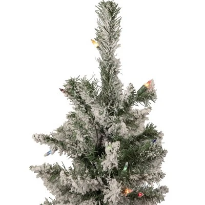 Make your festive season merrier with this flocked pine holiday tree. With beautiful branches and alluring pine needles, the tree ticks off all the boxes of what a focal point piece requires! We bet your guests can’t take their eyes off this beauty!Product Features: Pre-lit with 100 multi lights Multi-color consists of red, green, blue, yellow and orange bulbsBulb size: miniBulb type: incandescent 144 round tips 1.5″ – 2″ wide tips 32″ green lead cord Additional Product Features: Medium profile treeHinged branch constructionLight sets on tree are UL certified and approved for indoor or outdoor use, however the tree itself is recommended for indoor use If one bulb burns out, the rest will stay lit Lights are equipped with Lamp Lock feature, which makes them replaceable, interchangeable and keeps them from falling out2-piece easy assembly (including stand)Comes with replacement bulbs and spare fuses Comes with a plastic tree stand Wire gauge: 22120 volts, 60 hertz, .17 amps, 20.4 watts Dimensions: 3′ high (from the base of stand to the top of the tree)Distance from floor to the first row of branches: 5”25″ base diameter (at the widest point) Material(s): PVC/flocking/plastic/wire/glassNote: Branches are compressed for shipment, and need to be fluffed out upon arrival to look like the photo.
