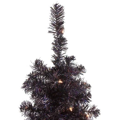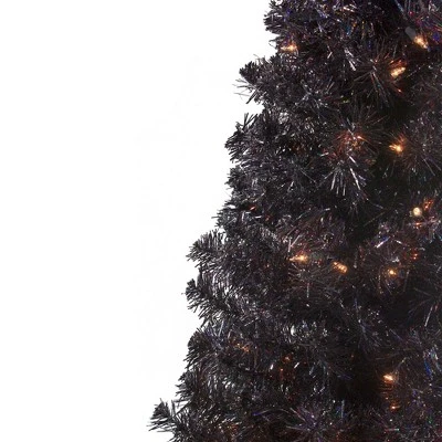 This pre-lit tree is an exciting hard-to-find designer black color, with matching black wire and clear bulbs. The needles on the tree are a mixture of black tinsel and black holographic tinsel which creates a majestic effect. Perfect to add to any room in your home for the holidays. Product Features: Pre-lit with 100 clear lights Bulb size: mini 242 tips 2″ wide tapered tips 36″ black lead cord Additional Product Features: Slim profile tree Light sets on tree are UL listed for indoor or outdoor use, however the tree itself is recommended for indoor use If one bulb burns out, the rest will stay lit Lights are equipped with Lamp Lock feature, which makes them replaceable, interchangeable and keeps them from falling out No assembly required – tree comes in 1 piece Comes with replacement bulbs and spare fuses Comes with a FREE black plastic stand Flame retardant Wire gauge: 22 120 volts, 60 hertz, .17 amps, 20.4 watts Dimensions: 4′ high (from the base of stand to the top of the tree) Distance from floor to the first row of branches: 6″ 29″ base diameter (at the widest point) Material(s): tinsel/metal/glass bulbs/wireNote: Branches are compressed for shipment, and need to be fluffed out upon arrival to look like the photo.