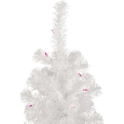 This beautiful white tree with pink lights adds a retro feeling to any holiday decor. The lush needles and slim profile, give the tree fullness, but it is ideal for small spaces and fits perfectly in corners. The branches are made from white PVC mixed with iridescent tinsel needles.Product Features:Pre-lit with 50 UL Pink LightsBulb size: miniBulb type: incandescent187 tips2″ wide tapered tips36″ white lead cordAdditional Product Features:Flat-round tips wrappedLight sets on tree are UL listed for indoor or outdoor use, however, the tree itself is recommended for indoor use only If one bulb burns out, the rest will stay litLights are equipped with a Lamp Lock feature, which makes them replaceable, interchangeable and keeps them from falling outComes with replacement bulbs and spare fusesNo assembly required – tree comes in 1 pieceWire gauge: 22120 volts, 60 hertz, .17 amps, 20.4 watts Dimensions: 4′ high (from the base of the stand to the top of the tree)Distance from floor to the first row of branches: 6″21″ base diameter (at the widest point)Material(s): PVC/metal/glass bulbs/wireNote: Branches are compressed for shipment, and need to be fluffed out upon arrival to look like the photo.