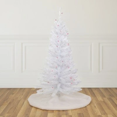 Transform your space into a winter wonderland with the beautiful Woodbury White Pine tree. It is a designer-inspired alternative to a traditional green tree with its dazzling white pine needles, sure to reflect the light from the vibrant pink mini lights that it comes adorned with. The lush needles give the tree fullness, but the slim profile makes it ideal for small spaces and allows it to fit perfectly in corners. Product features:Pre-lit with 50 pink lightsBulb size: miniBulb type: incandescent187 tips1.5″ wide branch tips26″ white lead cordSlim profile treeAdditional product features:Light sets on tree are UL listed for indoor or outdoor use, however, the tree itself is recommended for indoor use only If one bulb burns out, the rest will stay litLights are equipped with Lamp Lock feature, which makes them replaceable, interchangeable and keep them from falling outIncludes a white plastic tree stand2-piece easy assembly (including stand)Wire gauge: 22120 volts, 60 hertz, .17 amps, 20.4 watts Dimensions: 4′ high (from the base of the stand to the top of the tree)24″ base diameter (at the widest point)Material(s): PVC/plastic/glass bulbs/wireNote: Branches are compressed for shipment, and need to be fluffed out upon arrival to look like the photo.