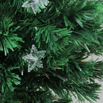Spread the festive ambiance to your space with this pre-lit artificial holiday tree. This tree with star embellishments is sure to make your home more welcoming and attractive for a holiday gathering. Your guests will love to capture some of their beautiful pictures in front of this lovely tree.Product Features:160 branch tipsPre-lit fiber optic tree has a multi-color wheel at baseFiber optic colors includes red, green, amber, purple, blue and whiteComes with a black plastic potMedium profile tree2-piece easy assembly (including pot)UL certified and approved for indoor use only72″ black lead cord with adapterInput: 120 volts, 60 hertz, 27.6 watts, .23 ampsDimensions: 4′ high (from the base of the pot to the top of the tree)25″ base diameter (at the widest point)Pot dimensions: 6″ high x 7.5″ wideMaterial(s): fiber optics/plastic/PVC/wire