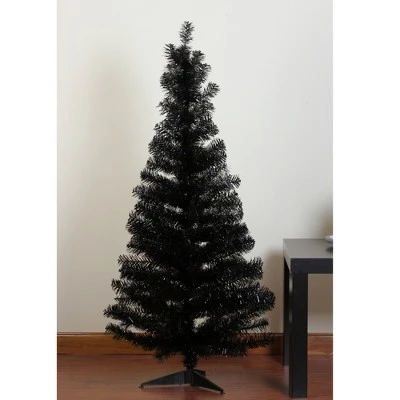 This versatility tree is perfect for taking Halloween decorations up a notch or a chic modern approach to holiday decor The needles on the tree are a mixture of black tinsel and black holographic tinsel which creates a majestic effect Product Features: Unlit 187 tips 2″ wide tapered tips Slim profile tree For indoor use only No assembly required – tree comes in 1 piece Comes with a FREE black metal tree stand Dimensions: 4′ high (from the base of the stand to the top of the tree) Distance from floor to the first row of branches: 6″ 24″ base diameter (at the widest point) Material(s): Tinsel/plasticNote: Branches are compressed for shipment, and need to be fluffed out upon arrival to look like the photo.