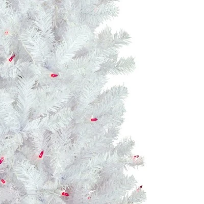 Transform your space into a winter wonderland with the beautiful Woodbury White Pine tree. It is a designer-inspired alternative to a traditional green tree with its dazzling white pine needles, sure to reflect the light from the vibrant pink mini lights that it comes adorned with. The lush needles give the tree fullness, but the pencil profile makes it ideal for small spaces and allows it to fit perfectly in corners. Product features:Pre-lit with 250 pink lightsBulb size: miniBulb type: incandescent716 tips1.5″ wide branch tips36″ white lead cordPencil profile tree4-piece easy assembly (including stand)Additional product features:Hinged branch constructionLight sets on tree are UL listed for indoor or outdoor use, however, the tree itself is recommended for indoor use only If one bulb burns out, the rest will stay litLights are equipped with Lamp Lock feature, which makes them replaceable, interchangeable and keep them from falling outIncludes a white metal tree standWire gauge: 22120 volts, 60 hertz, .34 amps, 40.8 watts Dimensions: 6.5′ high (from the base of the stand to the top of the tree)28″ base diameter (at the widest point)Material(s): PVC/metal/glass bulbs/wireNote: Branches are compressed for shipment, and need to be fluffed out upon arrival to look like the photo.