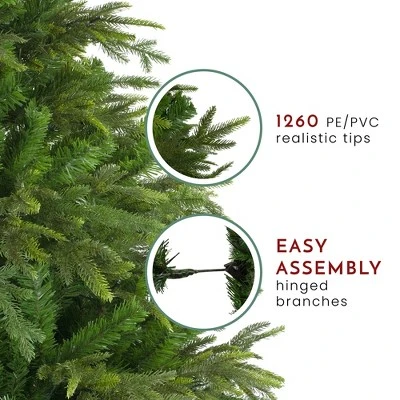 Create that beautiful holiday scene in your home using our gorgeous Roosevelt Fir artificial holiday tree. This tree is designed with a mixture of branches that will give off that realistic holiday tree looks and feel. Impress your guests after adding your favorite holiday lights to this unlit artificial tree along with other tree accessories. Product Features:Unlit1260 tips0.75″-2″ wide tapered tipsFull profile treeHinged branch constructionFor indoor use only4-piece easy assembly (including stand)Comes with a FREE black metal tree standDimensions: 6.5′ high (from the base of the stand to the top of the tree)50″ base diameter (at the widest point)Material(s): PE/PVC/metalNote: Branches are compressed for shipment, and need to be fluffed out upon arrival to look like the photo.