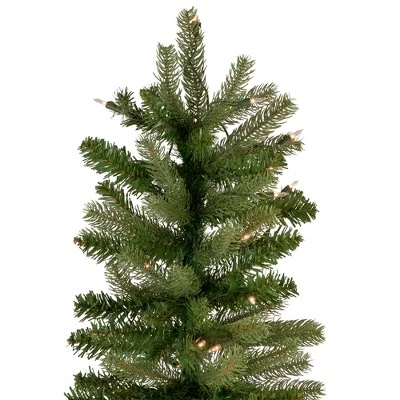 This gorgeous tree is sure to make your holiday season merry and bright. Its clear lights are sure to light up not only the branches of this tree, but also your home decor. Your family and friends will be delighted to see this durable and timeless addition to your holiday decor. Product Features:Pre-lit with 350 clear lightsBulb size: miniBulb type: incandescent900 tips1.5″ wide tapered tips34″ green lead cordAdditional Product Features:Pencil profile treeHinged branch constructionLight sets on tree are UL certified and approved for indoor or outdoor use, however the tree itself is recommended for indoor use only If one bulb burns out, the rest will stay litLights are equipped with Lamp Lock feature, which makes them replaceable, interchangeable and keeps them from falling out4-piece easy assembly (including stand)Comes with a FREE metal tree standWire gauge: 22 120 volts, 60 hertz, .51 amps, 61.2 watts Dimensions: 7.5’ high (from the base of the stand to the top of the tree)32″ base diameter (at the widest point)Material(s): PE/PVC/metal/glass bulbs/wire