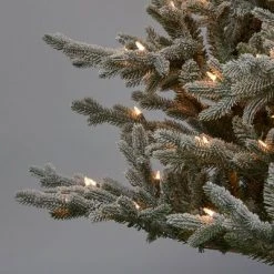 If you’ve been missing that “wow!” factor with previous holiday trees, look no further than this stunning artificial Jasper Balsam Fir. This full-bodied tree is sure to impress your guests, with its lush profile and life-like branch tips. The branches come with a dusting of snow for that wintry look. The tree also comes pre-lit with classic clear lights, making decorating even easier. It’s easy to imagine all the presents you can fit underneath!Product Features:Pre-lit with 1000 clear lightsBulb size: mini2149 branch tips2″ wide tapered tipsAdditional Product Features:Full profile treeHinged branch constructionLight sets on tree are UL certified and approved for indoor or outdoor use, however, the tree itself is recommended for indoor use only If one bulb burns out, the rest will stay litComes with replacement bulbs and spare fusesComes with a FREE black metal tree stand Dimensions: 7.5′ high (from the base of the stand to the top of the tree)76″ base diameter (at the widest point)Material(s): PE/PVC/flocked/metal/glass bulbs/wireNote: Branches are compressed for shipment, and need to be fluffed out upon arrival to look like the photo.