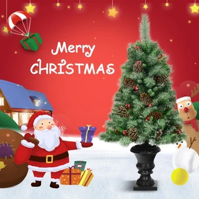 - Realistic Appearance & Exquisite Shape: Crafted with 37 snow sprayed pine needles and 187 PVC tips, the 4 ft artificial Christmas tree is leafy and will give you a realistic look. In order to create a romantic holiday atmosphere and decorate venues with different styles, we decorated this Christmas tree with pine cones and red berries.