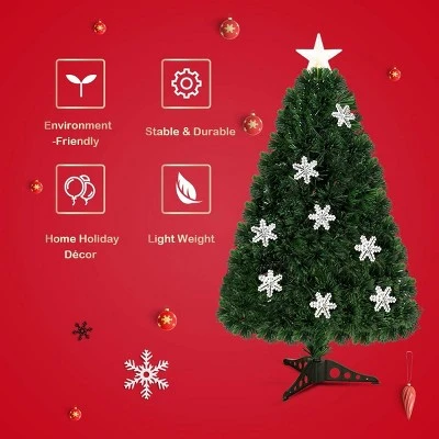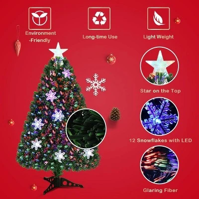 Our Christmas tree needles are made of high-quality PVC material, making the trees more real and full. This Christmas tree is pre-lit with low voltage LED lights and optical fiber tubes, which are energy-efficient and long lasting. 12 LED lights which will present 7 different colors(red, blue, white, green, yellow, purple, pink) make this tree shiny and attractive. A tree-top star is also included. These gleaming lights surround throughout the tree, thus will create a warm and romantic festive atmosphere to your home with eye-catching effect to your guests.