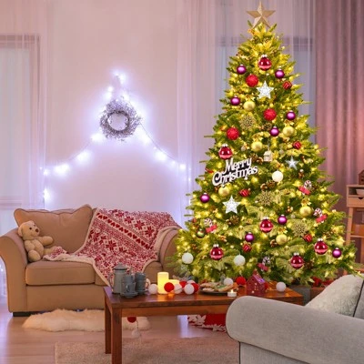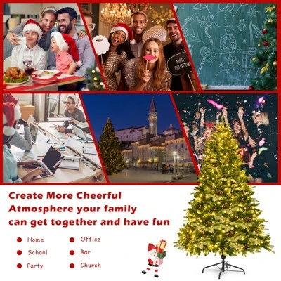 - 【Pre-lit Warm White LED Lights】This Christmas tree is pre-strung with 450 warm white LED lights on branches for no assembly and ease to use. These LED lights are energy-efficient and long lasting. Pre-lit design saves your time to set up electric lines. Energy-saving lights provide warm white lighting effects to help create a merry and jolly atmosphere.