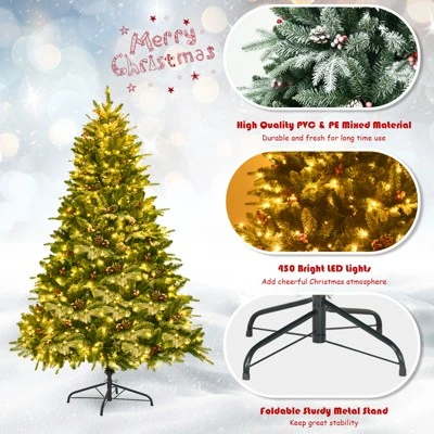 - 【Snow Flocked 6.5FT Christmas Tree】Crafted with 673 branch tips and snow flocked leaves, this 6.5 ft Christmas tree is leafy and vivid. It will give you the illusion of a full-bodied genuine tree. The branches, dotted with red berries and pine cones, are very attractive. It will bring vitality to any room decor.