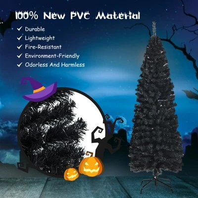 This black slim Halloween Christmas tree brings a whole new dimension to your seasonal decorating scheme. Slim and sleek, this realistic pencil tree with a matching stand is perfect for display in corners or areas with limited floor space. Moreover, it is designed with 2 section trunk structure to make the assembly easy for the coming festival preparation. Made of new odorless PVC material, the tree is crack-resistant and non-flammable for a long lifespan and allows you to use it for a long time. The all-black appearance makes it an eye-catching addition anywhere and A super-slim pencil silhouette means this versatile tree will never go out of style!