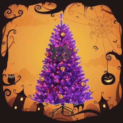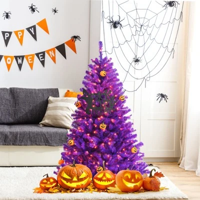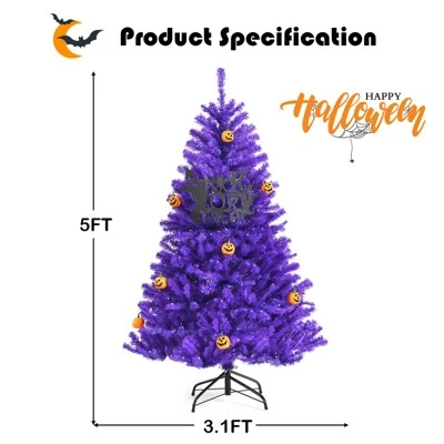 Bring strong holiday atmosphere home by adding a prelit purple artificial Christmas tree. Once attach to the robust foldable metal stand, this amazing Halloween tree will stand firmly. This realistic purple tree looks dense and lush and will magically bring mysterious feeling to your room. Equipped with orange LED lights and several mini pumpkin ornaments, the tree is bright enough to light up your room and show special and mysterious atmosphere to cheer up your guests. Made of 100% new PVC, the tree shows an outstanding performance. The smell-free, recyclable and flame-retardant faux tree is safe for daily use. And you can setup the hinged tree easily anywhere. It is an ideal decoration for home, office or supermarket.