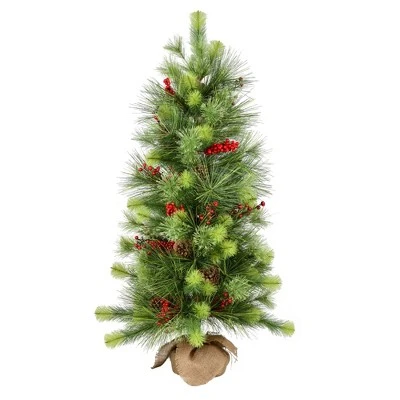 Vickerman Morris Pine Artificial Christmas Tree with Hardneedle/PVC Tips. It features a lush green blend of PVC and Hardneedle tips, pine cone and natural looking berry accents, and is fixed in a decorative burlap base.