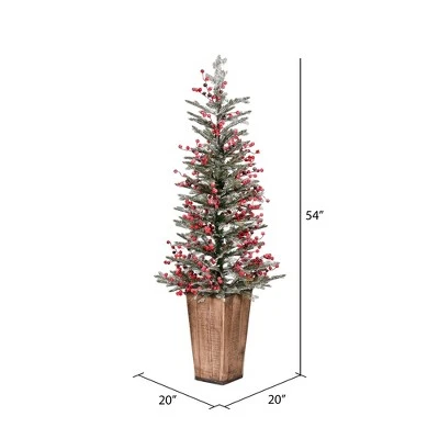 Vickerman Frosted Berry Potted Pine Artificial Christmas Tree with tips made of PE and PVC material. This tree features beautifully frosted blend of PE and PVC Tips, berry accents, and is fixed in a decorative resin pot.